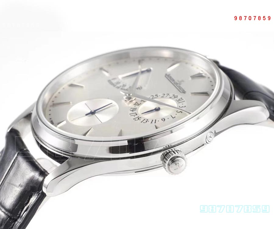 菱形刻度时标采用立体镶嵌,都经过细腻的抛光打磨,美观大方,读时也方便。12点下方的积家logo印刷饱满立体,以及所有字体的印刷干净整齐,没有油墨溢出的现象。指针为阴阳指针,一边磨砂一边抛光。层次分明,这种工艺的好处是方便人们更好的读取时间。白色盘面设计极具风格,辨识度很高,盘面虽然有3个小盘,看似复杂实则简单,3点位是一到三十一的日历显示盘,6点位是常规小秒盘,9点位是扇形动能储蓄盘,所有功能同原版一致。中间一圈一圈的为CD纹,日历字体刚好在圆圈范围内,不会偏上或偏下。小针为烧钢蓝针,指针立体感很强,对比起正品长短度也一致。